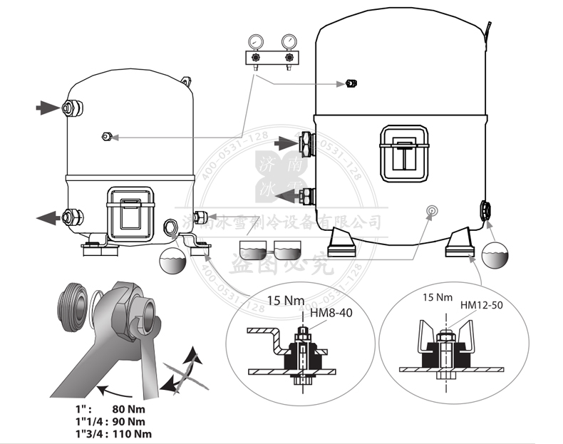 盡快將壓縮機(jī)連接至系統(tǒng),以避免周?chē)h(huán)境中的水分污染潤(rùn)滑油。